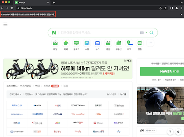 코드를 실행하면 브라우저 창에 'Chrome이 자동화된 테스트 소프트웨어에 의해 제어되고 있습니다.' 문구가 표시됩니다.